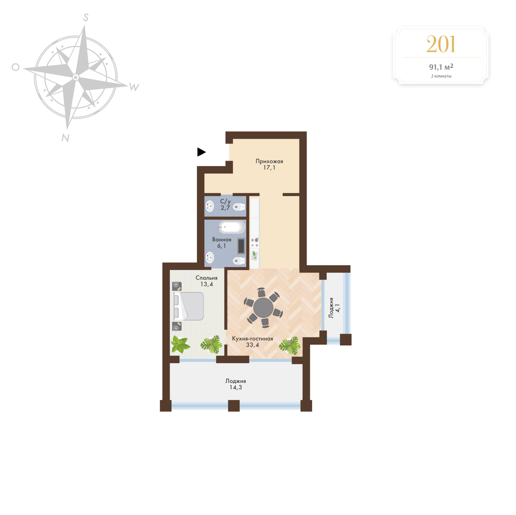 Один из самых компактных апаратментов в комплексе для небольшой семьи. Выход из спальни и гостиной на общую лоджию дает возможность наслаждаться утренним кофе на открытом воздухе.