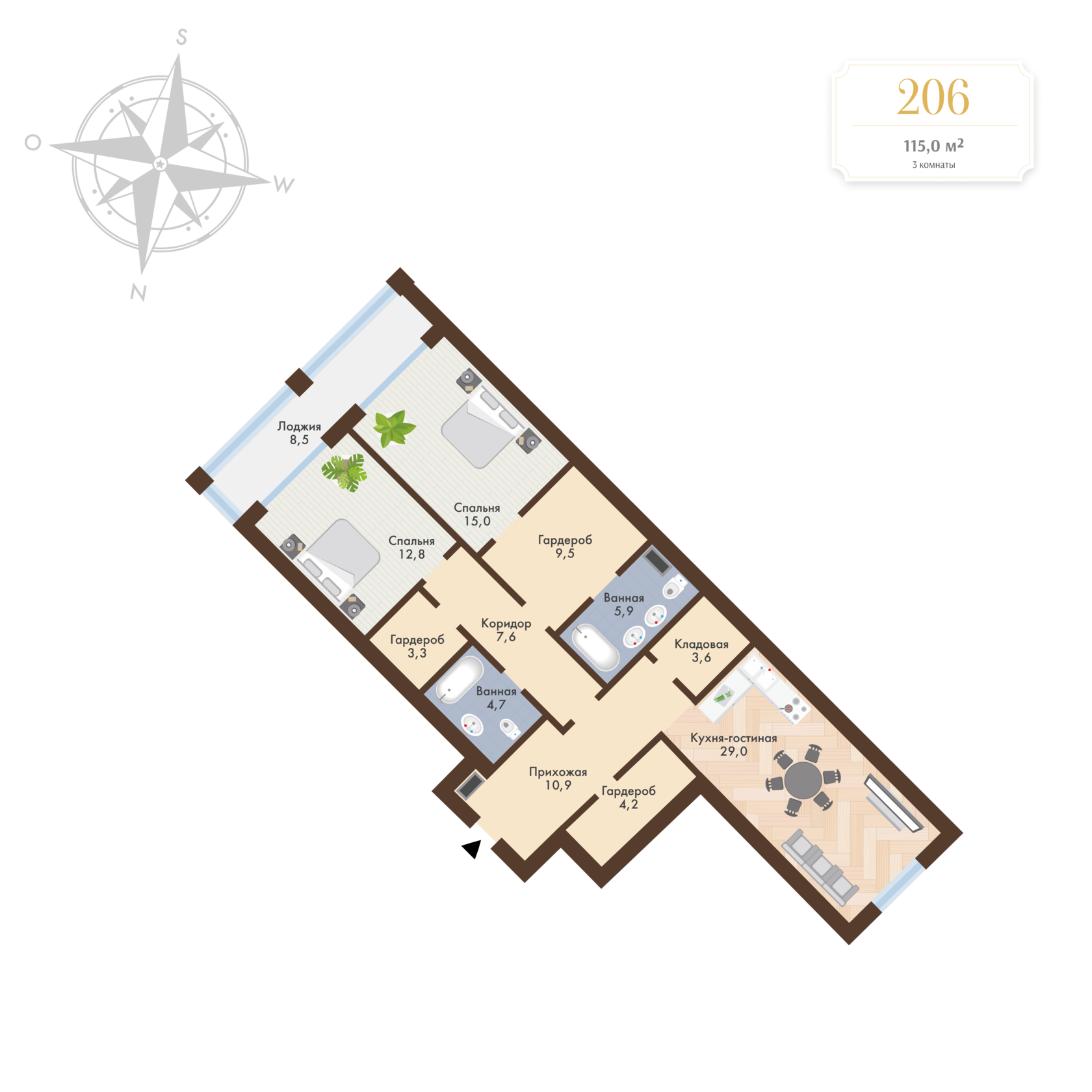 Окна данного апартамента выходят на две стороны, а две спальни имеют выход на лоджию, с которой открывается восхитительный вид на залив.