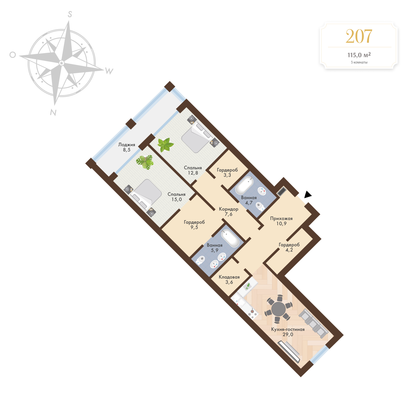 Окна данного апартамента выходят на две стороны, а две спальни имеют выход на лоджию, с которой открывается восхитительный вид на залив.