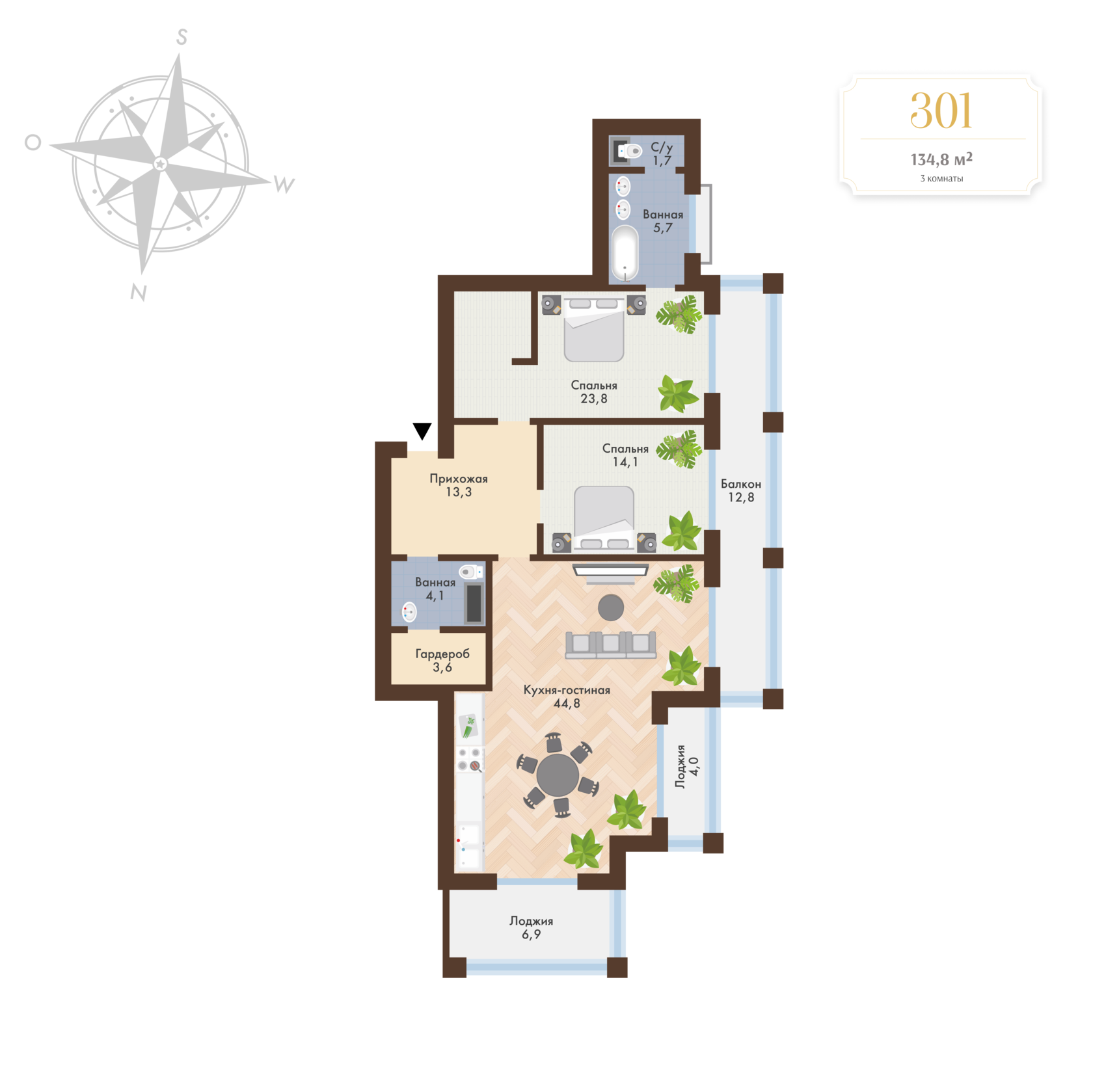 Просторная гостиная, большой балкон и виды на две стороны - вот отличительные особенности данного апартамента. А если добавить окно в ванной комнате, то преимущества данного апартамента становятся очевидны.