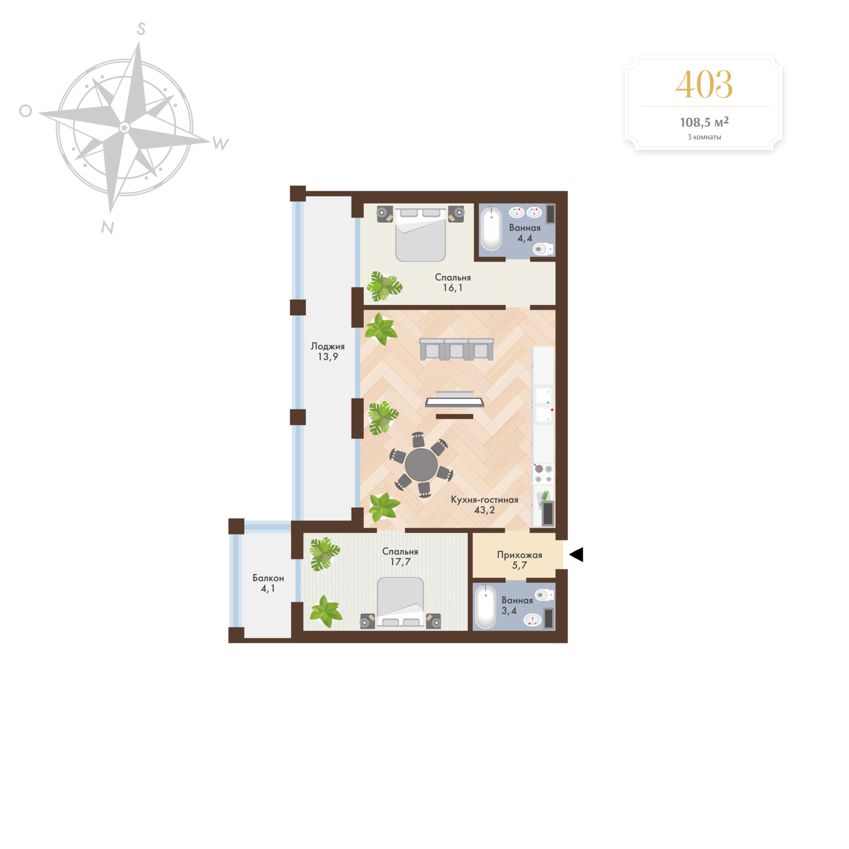 Функциональная планировка апартамента дает возможность его хозяевам чувствовать себя максимально комфортно - спальня хозяев с отдельной ванной комнатой максимально далеко отнесена от входной группы. Прекрасные видовые характеристики.