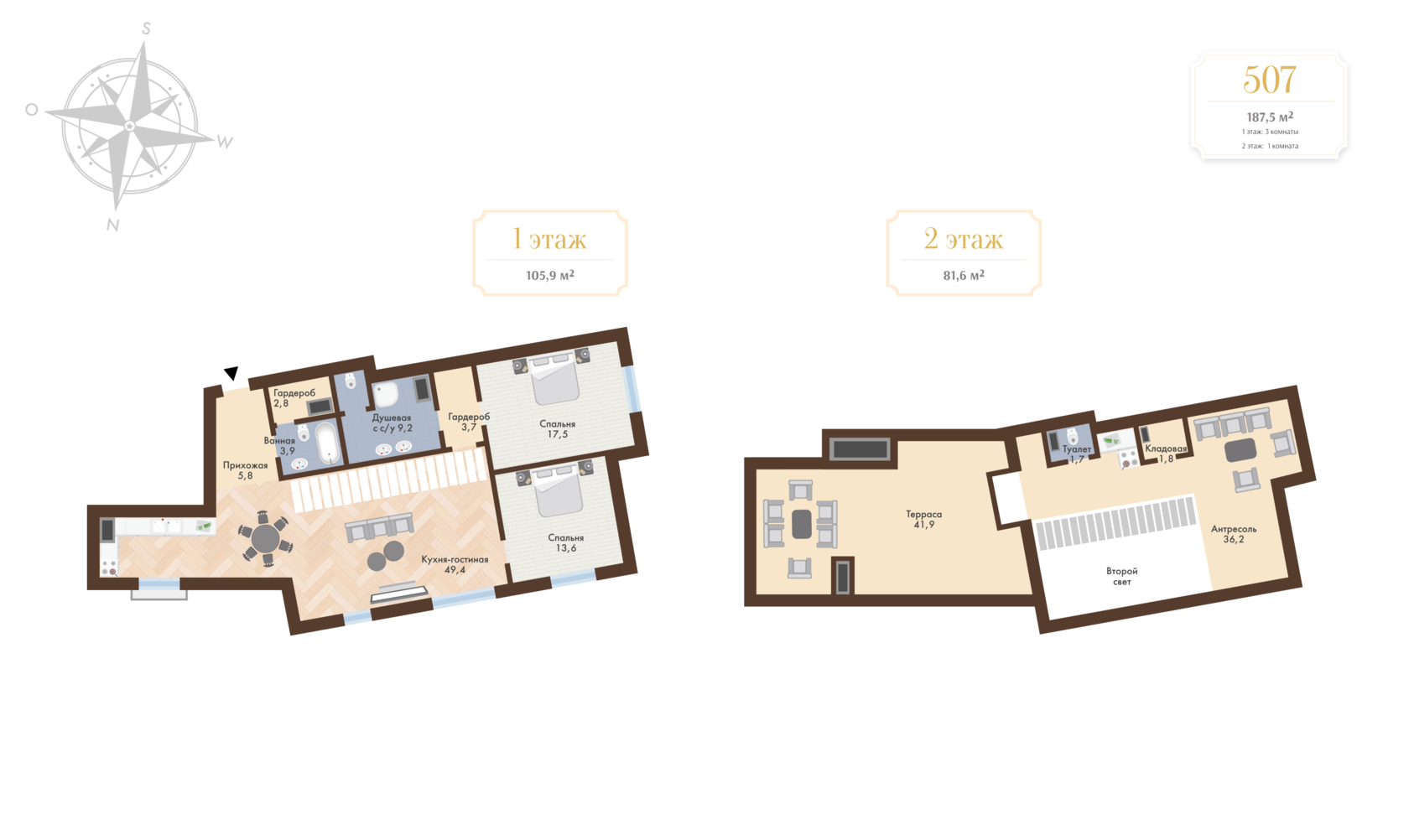 Максимум света - вот девиз этого просторного двухуровнего апартамента со вторым светом, окна которого максимально ориентированы на Восток. Все комнаты имеют вид на Волгу. Самые лучшие виды открываются с террасы второго этажа апартамента.