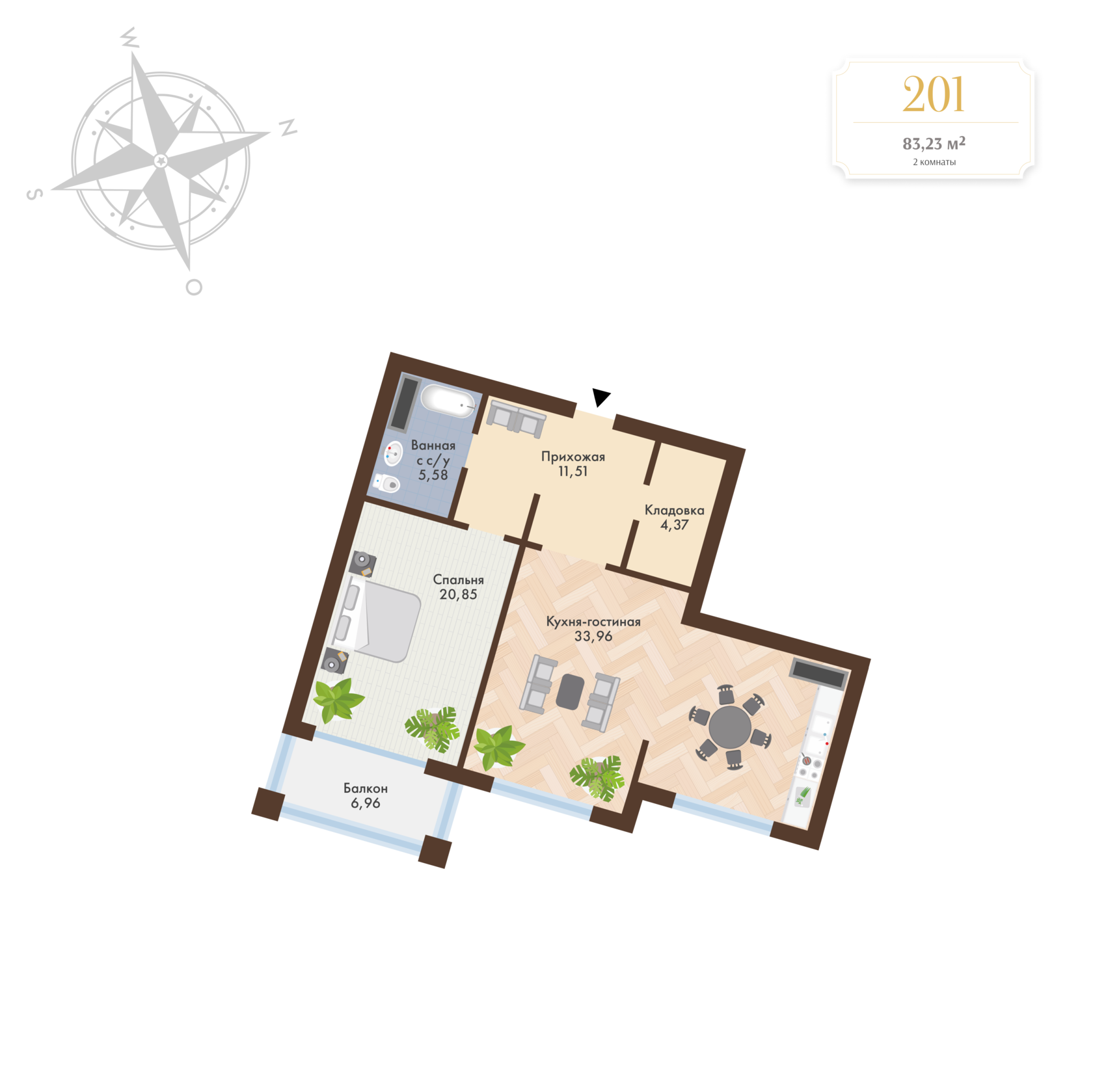 Один из самых лаконичных апартаментов в доме. Продуманная планировка для небольшой семьи, выход из спальни на балкон. Прекрасные виды на Екатериновку и на Волгу.