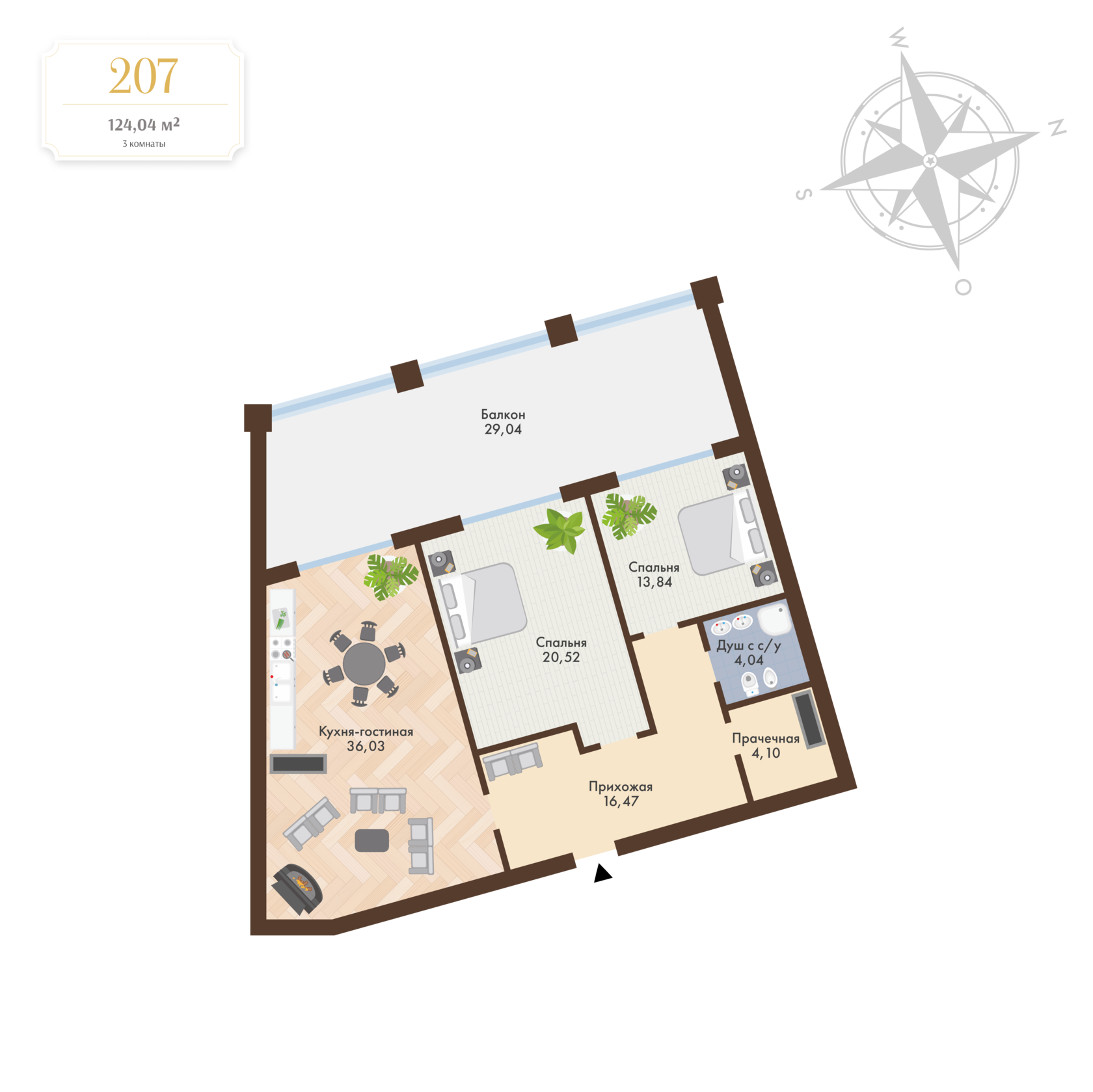 Функциональная планировка, камин в гостиной, большой балкон, на который можно попасть из всех комнат и любоваться видами на залив - вот достоинстава данного апартамента.