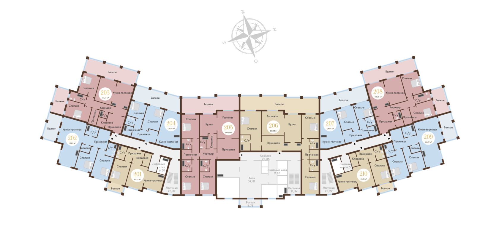 На этаже 10 резиденций площадью от 83 до 233 кв.м.