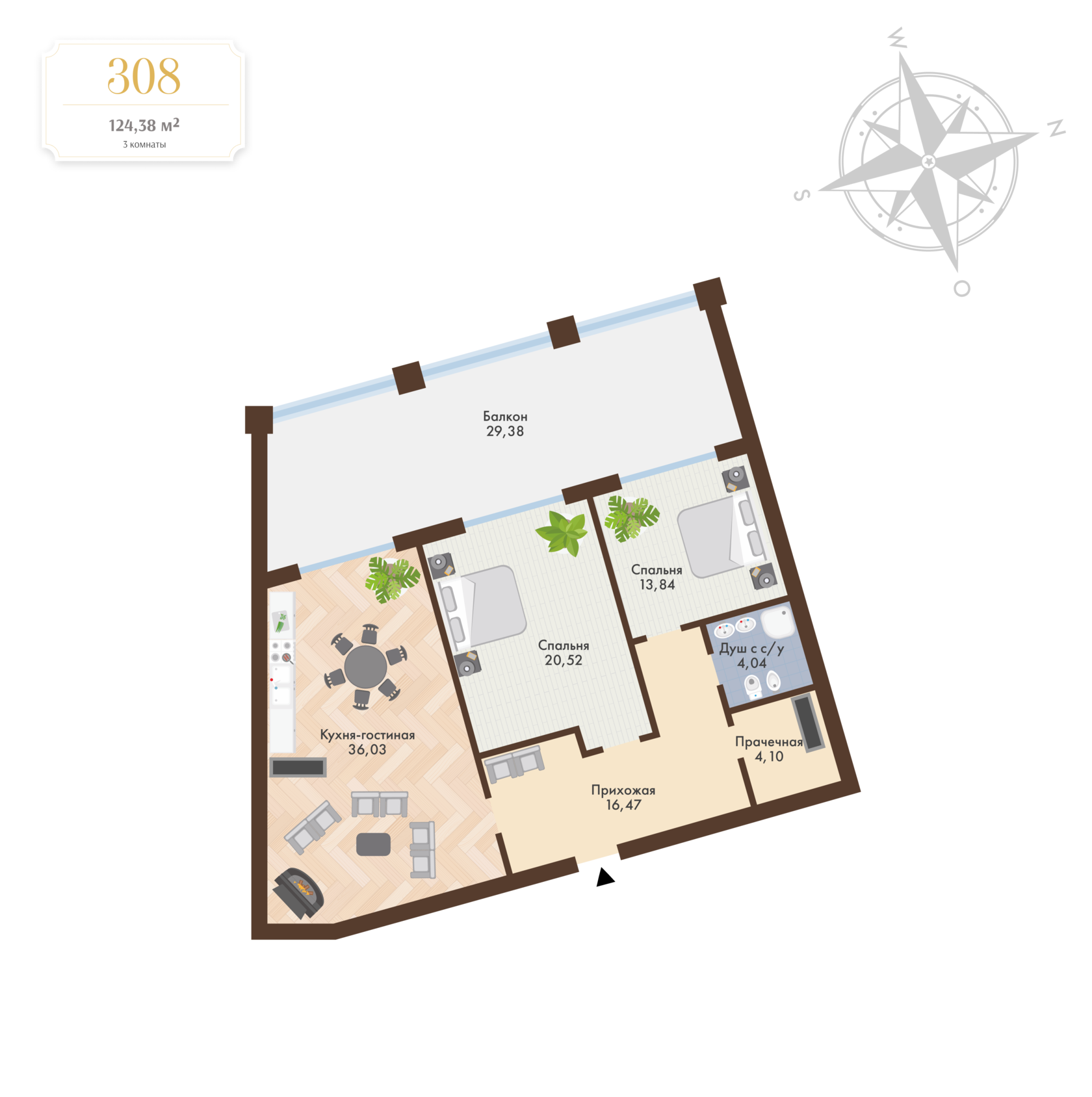 Функциональная планировка, камин в гостиной, большой балкон, на который можно попасть из всех комнат и любоваться видами на залив - вот достоинстава данного апартамента.