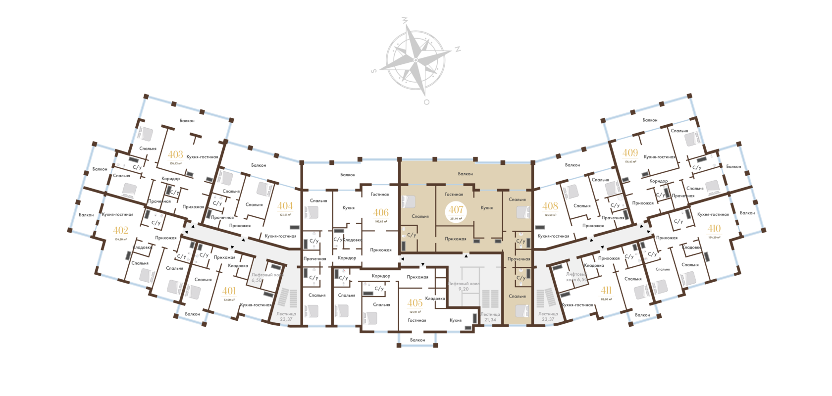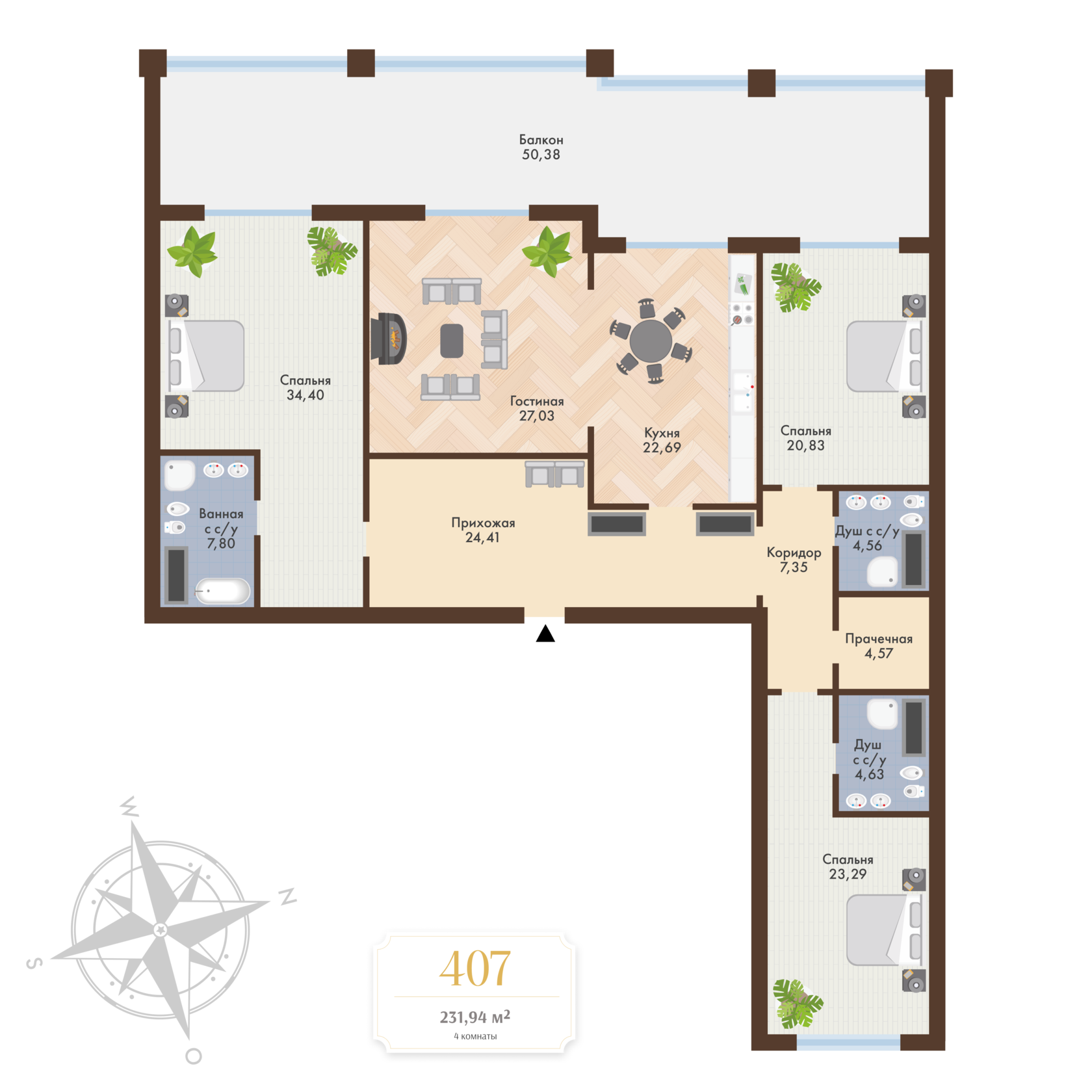 Это один из трех самых роскошных апартаментов в этом доме - большая кухня-гостинная с камином и спальня хозяев, создают ощущение простора. Практически из всех комнат есть выход на большой балкон, с которого открываются головокружительные виды на залив. Из одной спальни открываются виды на Волгу. Виды из окон данного апартамента без преувеличения можно назвать лучшими в этом доме.