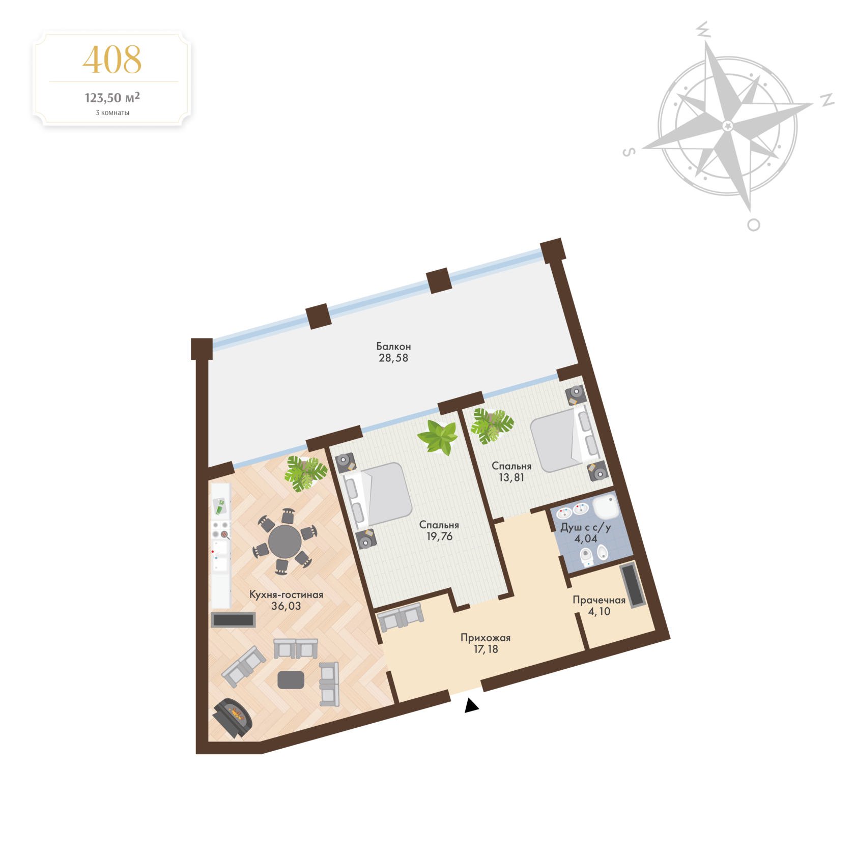 Функциональная планировка, камин в гостиной, большой балкон, на который можно попасть из всех комнат и любоваться видами на залив - вот достоинства данного апартамента.