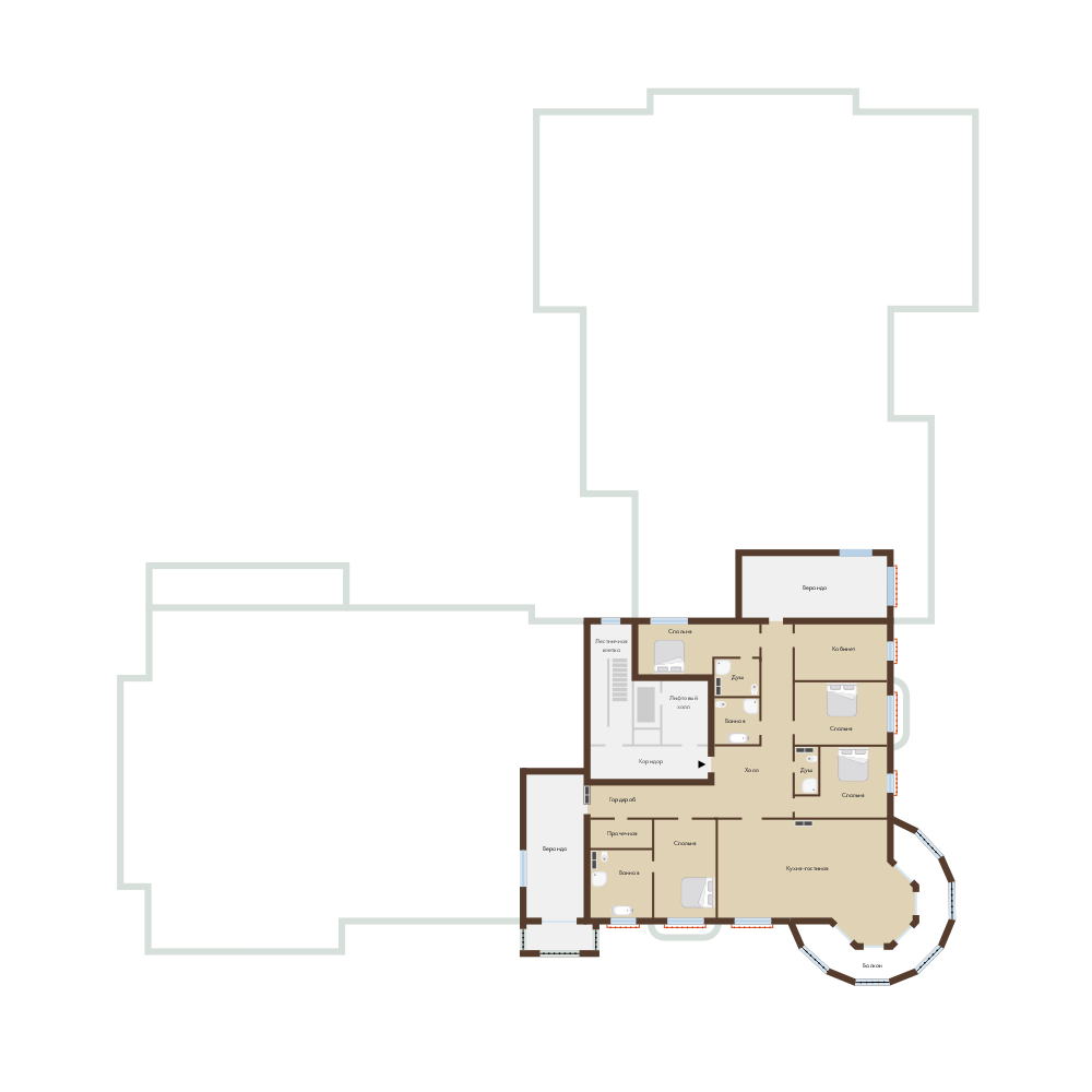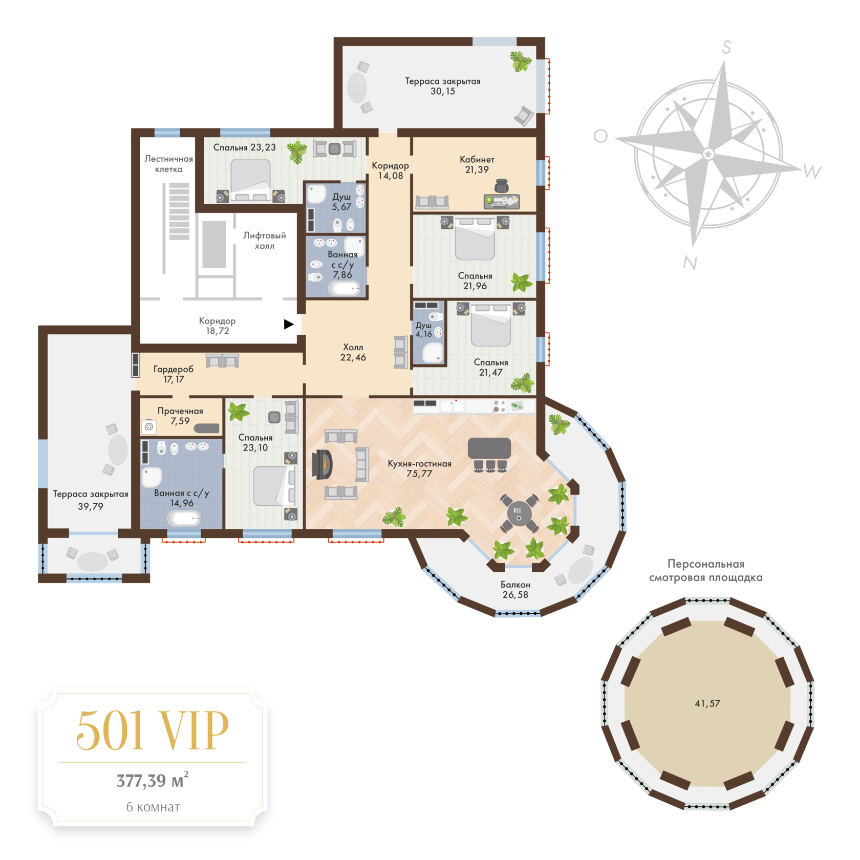 Ограниченным доступ на этаж. Собственный выход на террасу на высоте 20 метров. Установлен большой камин. Площадь 6 комнатного пентхауса 377,39 кв.м.
