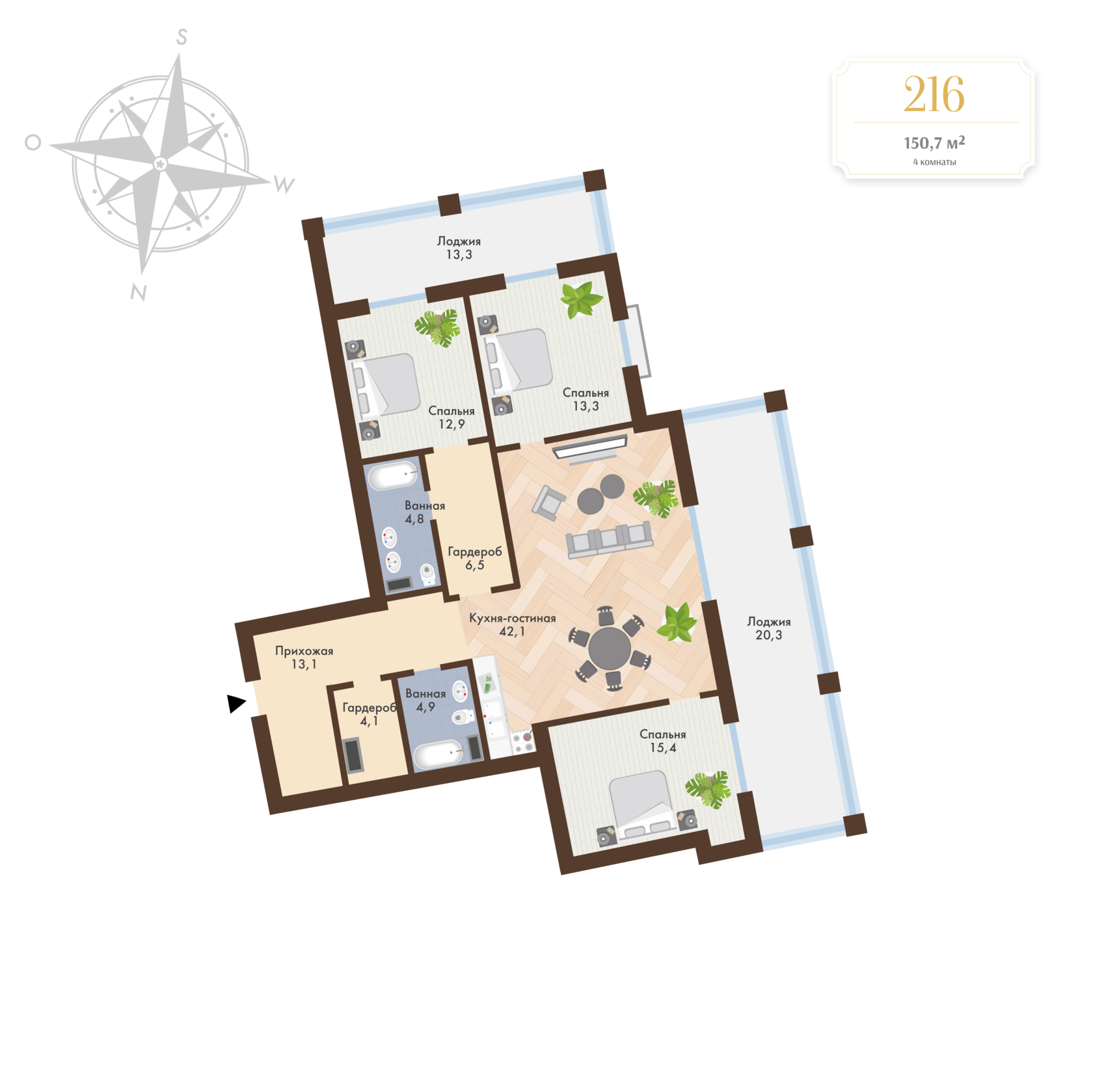 Просторный апартамент с продуманной планировкой и шикарными видовыми характеристиками. Окна двух спален выходят на залив, а гостиная и гостевая спальня выходят окнами на Волгу. Один из двух апартаментов, которые выходят на внутренний балкон с зоной отдыха и вторым светом.