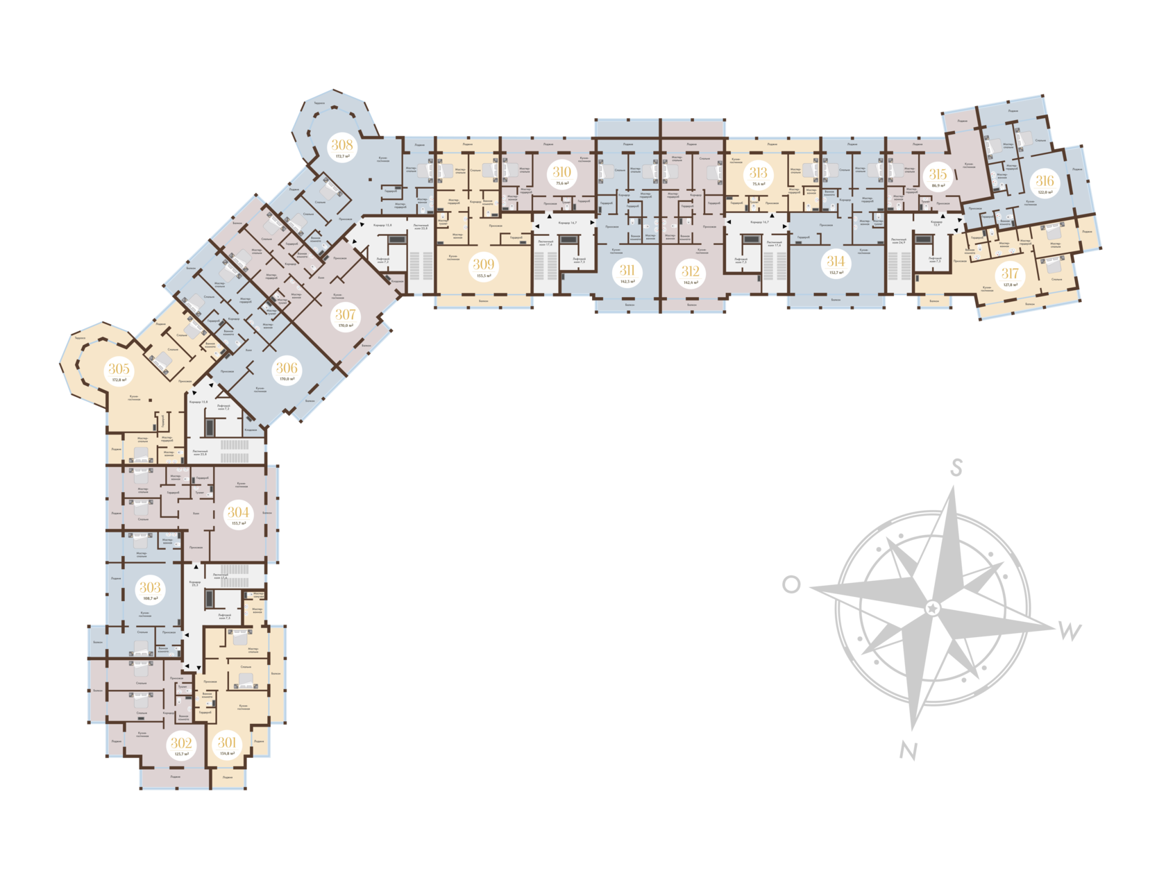 На этаже 17 резиденций площадью от 75,40 до 172,8 кв.м.